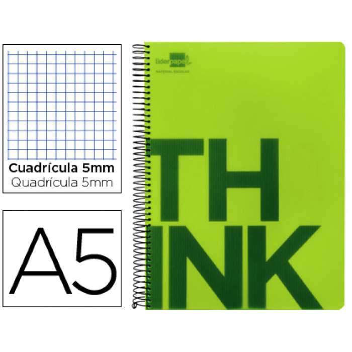 Cuaderno espiral LIDERPAPEL A5 micro think tapa plastico 140h 80 gr cuadro 5mm 5 bandas 6 taladros verde. Tapa de polipropileno transparente ondulado de 800 micras Diseño impreso en cartulina de 180 g/m² Papel de 80 g/m² Espiral nylonizada negra Con margen Coil-lock