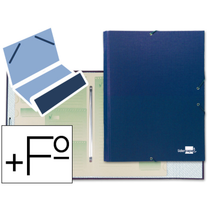Carpeta clasificadora LIDERPAPEL 12 departamentos folio prolongado carton forrado azul. Carpeta fabricada en cartón entrecolado de 1,75 mm de grosor, forrado con papel de encuadernación plastificado, gofrado tela en pvc Guarda interior impresa Con solapa 12 departamentos Cierre con gomas Tamaño folio prolongado