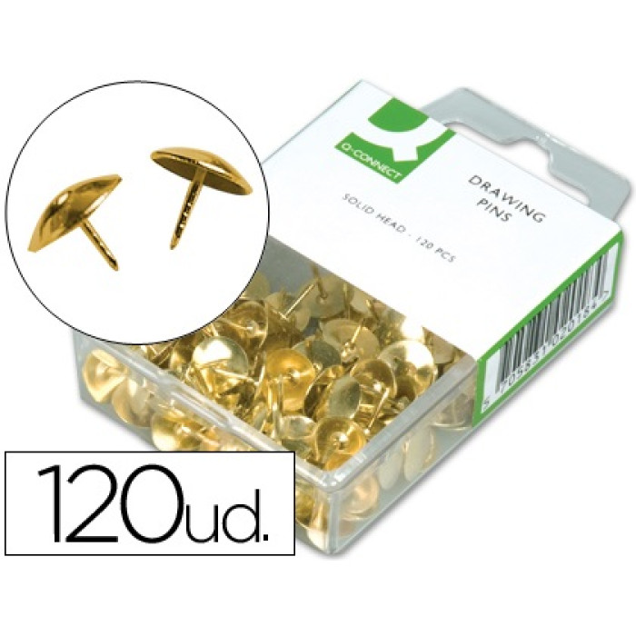 Chinchetas q-connect doradas -caja de 120 unidades. Chinchetas de cabeza plana. Diámetro de la cabeza: 9 mm. Caja de 120 unidades.