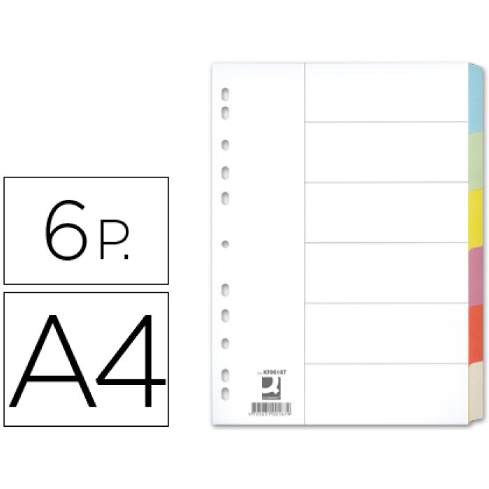 Separador Q-CONNECT cartulina juego de 6 separadores din a4 multitaladro. Juego de separadores fabricados en cartón de 175 g/m² Pestañas en colores pastel Para archivar en diferentes mecanismos de anillas Incluye carátula con índice